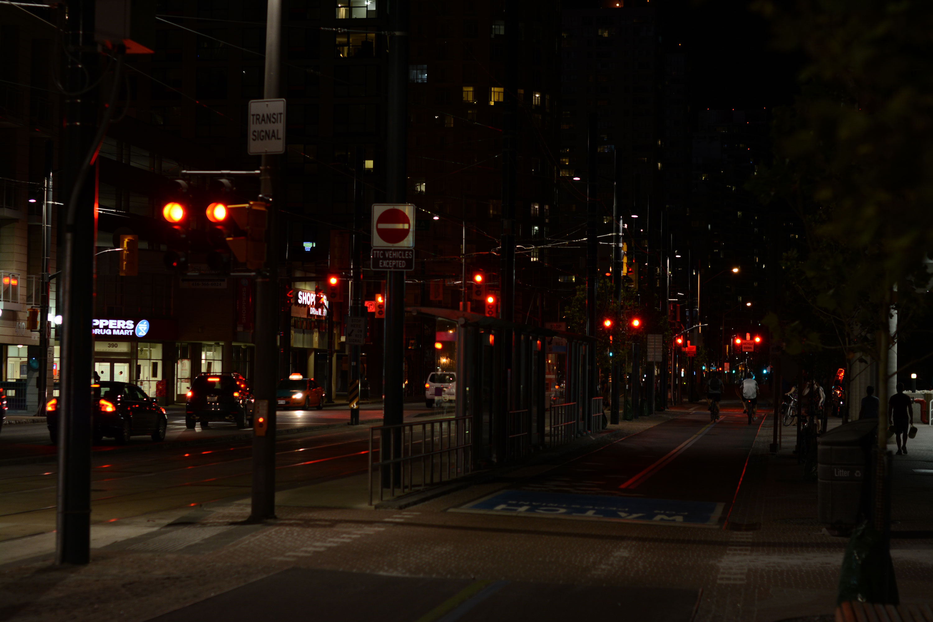 But—of course—before the pictures, some more words. In Part I my dad and I walked around CityPlace on a bright summer day. This time, along with my sister, we did a night shoot along Queens Quay on a warm summer night.