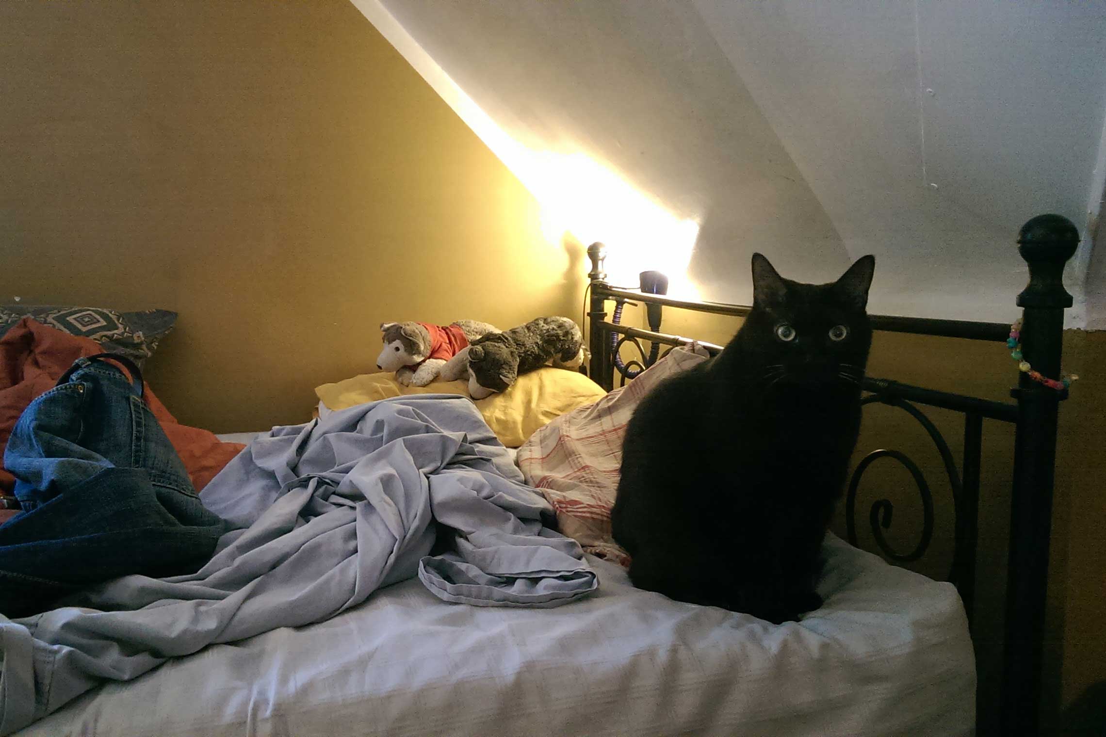 This is Freddy, and he comes to my room to hang out before and after work. He sleeps at the end of the bed. He purrs loudly and I feed him clam snacks and brush his fur. He rolls on his back and stretches out to get tummy rubs. I thought he was a black cat at first, but his coat in the bright daylight is a rich chocolate filled with tabby echoes. He’s sitting in my lap right now reminding me it’s time for more snacks.