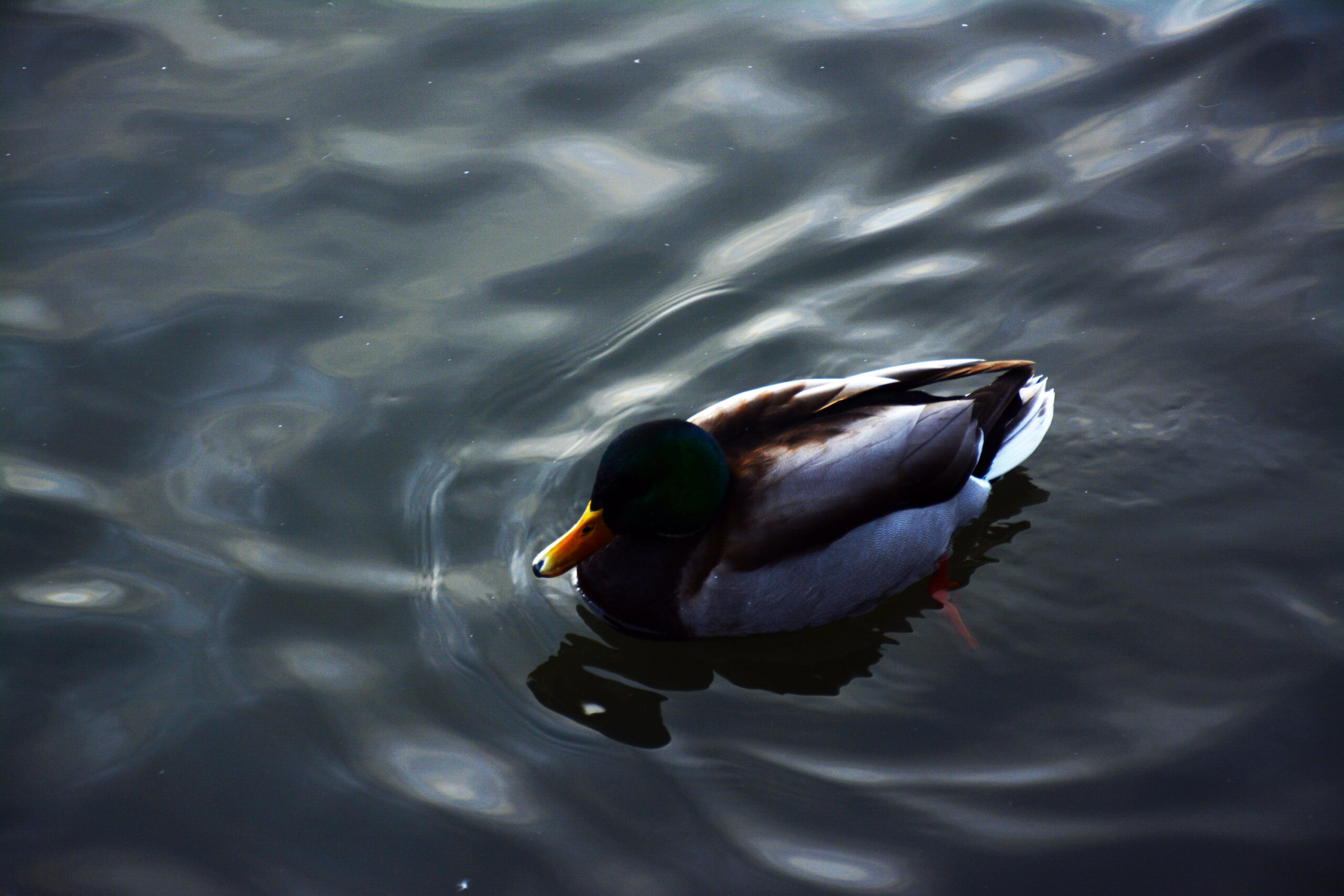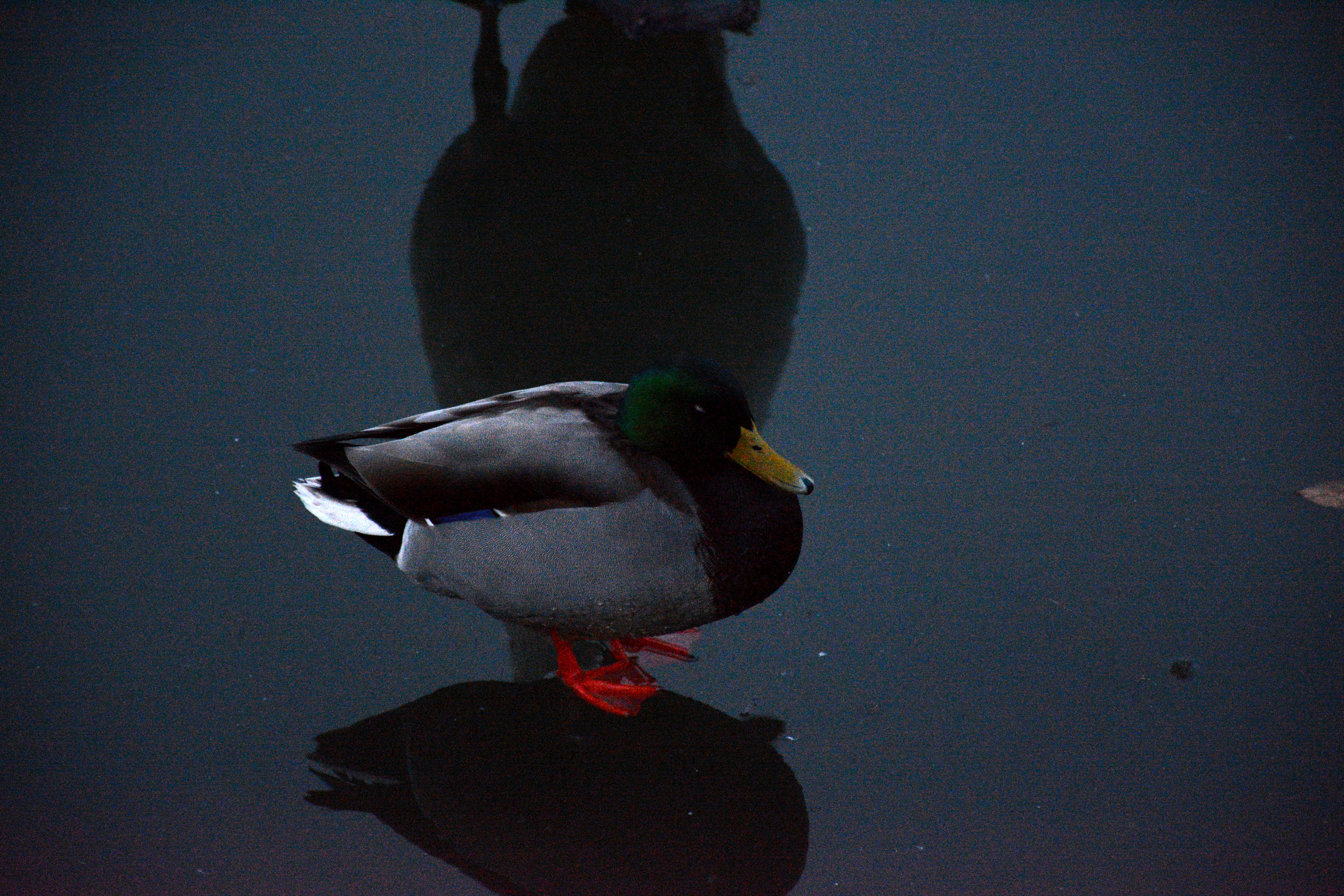 I return to the pond I’d first walked by yesterday—wait, no—earlier that day. Much earlier that day. Time is becoming disorganized in my mind. My body is starting to figure out I’ve tricked it into thinking it was more rested than it was. The smattering of late afternoon sunlight and shadows has been replaced with grey cloud cover. The feel of the air has changed: now it’s dry and cold instead of wet and cold. As I look out over the pond focused on nothing in particular a single and unanticipated quack demands my attention.